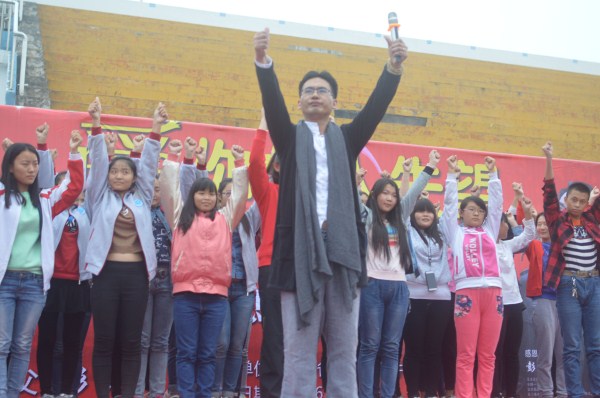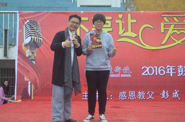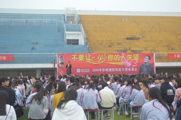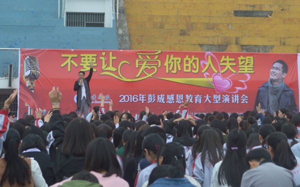 演讲会上,彭成老师用他那富有亲和力的姿态和富有感染力的语言,以自己的亲身经历为主线告诉同学们应该感恩父母、感恩长辈,感恩老师……。彭老师时而引用真切感人的故事,时而讲述,时而又跟学生、家长和老师互动,现场掀起了一个又一个的感恩高潮。在场的老师和部分家长也被邀请走上了演讲台,回顾了与学生交往过程中的点滴往事,学生代表情不自禁涌上台与老师、家长紧紧拥抱。一声声“老师,您辛苦了!”“老师,我爱您!” “爸爸妈妈,我爱你!” ……一句句发自肺腑的呼声震撼人心。整个演讲会持续了三个多小时,内容精彩,气氛热烈,互动频繁,高潮迭起。整个会场沉浸在一片震耳欲聋的倾情呼喊中,沉浸在一片感恩之溪汇成的爱的海洋中……