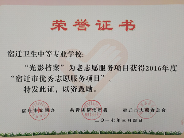 近日,宿迁卫校再添荣誉,市文明办、团市委、市志愿者总会联合授予我校“光影档案”为老志愿服务项目2016年度“宿迁市优秀志愿服务项目”奖,并有两名志愿者荣获“宿迁市优秀志愿者”荣誉称号。