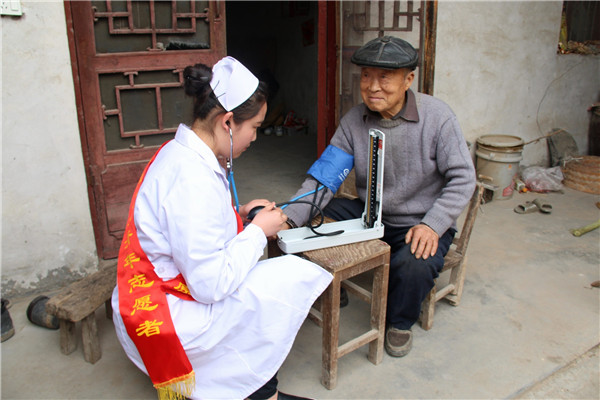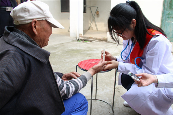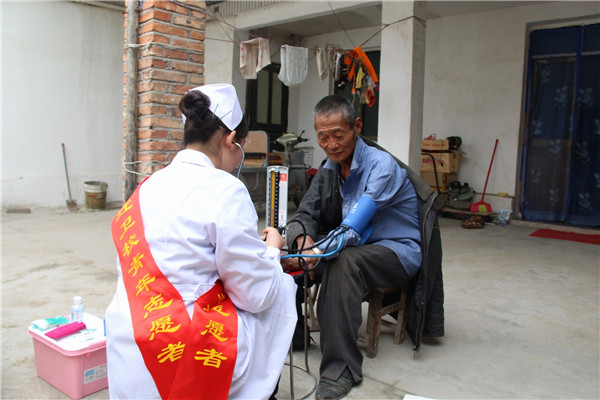在志愿者们对老人的个人情况、身体状况、日常饮食及家庭环境重新评估后,帮助老人进行了血压、血糖的测量,并进行了健康宣教,受到了在场百姓的围观与欢迎。