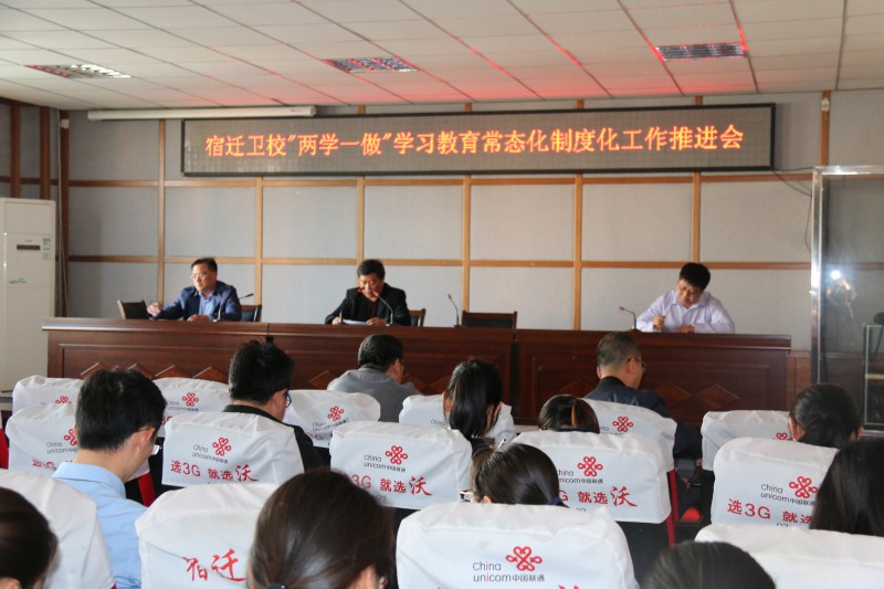 校党委委员、副校长张生玉宣读了《宿迁卫校推进“两学一做”学习教育常态化制度化实施方案》。校党委书记、校长王辉阳指出,2016年以来,学校按照基础在学、关键在做的要求,突出以上率下,突出问题导向,突出经常性教育特点,深入开展“两学一做”学习教育,取得了显著成效。王辉阳提出,学校要从三个方面推进“两学一做”学习教育常态化制度化。一是充分认识“两学一做”学习教育常态化制度化的重大意义,把思想和行动统一到中央的决策部署上来。认识到“两学一做”学习教育常态化制度化,是党的思想政治建设的重要途径,是党员队伍建设的重要举措。二是深刻领会推进“两学一做”学习教育常态化制度化的指导思想,准确把握目标任务和原则要求。坚持在学思践悟上深化拓展,筑牢思想根基;坚持在“四个合格”上深化拓展,形成先锋力量;坚持在整改落实上深化拓展,勇于自我革新;坚持在领导带头上深化拓展,突出“关键少数”; 坚持在建强支部上深化拓展,形成战斗堡垒。三是切实发挥党支部书记作用,深入推进“两学一做”学习教育常态化制度化。“两学一做”学习教育常态化制度化最终要靠党支部书记来具体抓落实。支部书记要勇于担当、主动作为,要注重发挥党建制度的保障作用,要注重发挥党内活动的载体作用,把“两学一做”学习教育抓实抓好。