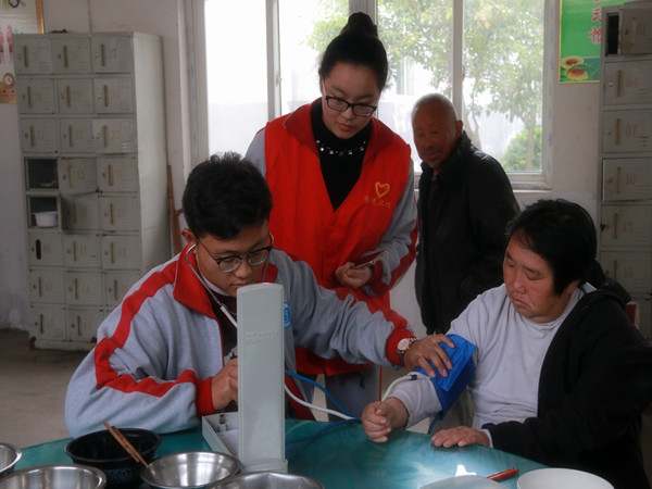 重阳佳节,关爱老人,从心开始,从你我做起。在重阳节来临之际,宿迁卫校13名志愿者带着血糖仪、血压计、听诊器等仪器,来到晓店敬老院,为那里的54位孤寡老人进行健康检查。