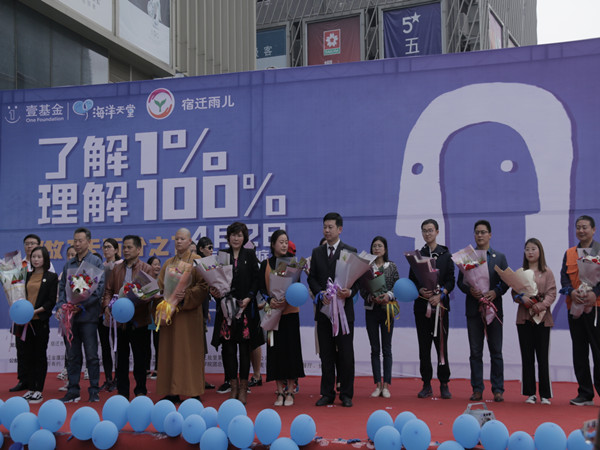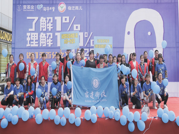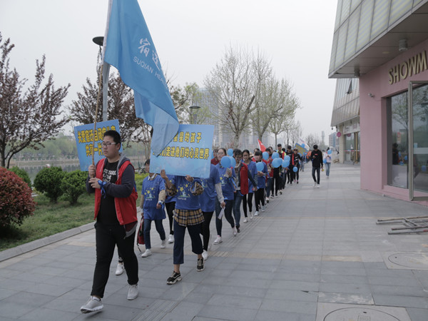 4月1日下午,我校团委43名青年志愿者参加了由宿迁市特殊需要儿童康复协会携手宿城中专繁星志愿者协会、宿迁市助残志愿者协会、宿迁学院楚暖志愿者团队等多家爱心单位举行的“感谢有你,与星星同行”关注自闭症儿童蓝色公益宣传活动。