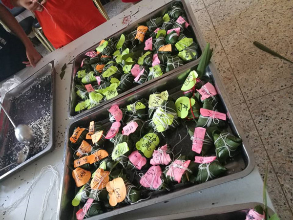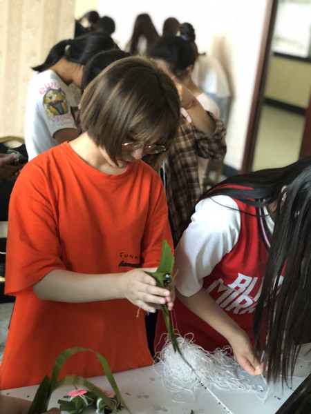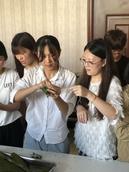 活动中,粽叶舞动,麻绳穿梭。同学们学着包粽子的手法,有的同学双手将粽子叶卷成漏斗状后,用糯米充实压紧,再用细绳打个结,动作麻利优美。在食堂师傅的指导下,没一会工夫就包出了各种奇形怪状的粽子,有三角的,四角的,长方形的,颇有特色。虽然包出来的粽子没有我们想象的那么漂亮,但那是同学们亲手制作的,也别有一番滋味。一下午的时间,师生们包出两百多个粽子,同时分批煮好,趁热送给校内同学品尝分享。