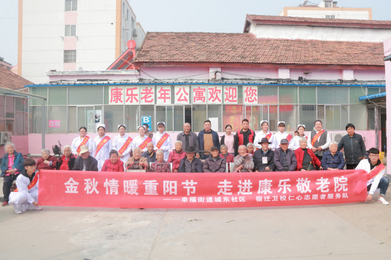尊老敬老,厚德仁爱;志愿服务,情暖重阳。在中华民族的传统节日――重阳节到来之际,宿迁卫校仁心志愿者服务队走进幸福街道城东社区康乐敬老院,为老人们送去健康与关爱,使老人们感受到大家庭的温暖。
