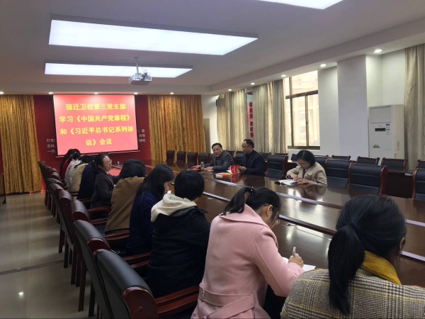 2018年11月13日下午4点,宿迁卫校第三党支部在党员活动室召开党员会议,会议主要有两项内容,首先张生玉副校长带领党员学习《习近平总书记系列重要讲话》,然后支部书记胡军为党员上党课,学习《中国共产党章程》和《中国共产党纪律处分条例》,参加学习的每一位党员认真聆听,对学习的内容都进行了仔细、认真的记录,通过学习党员的思想觉悟和工作能力得到了提高。