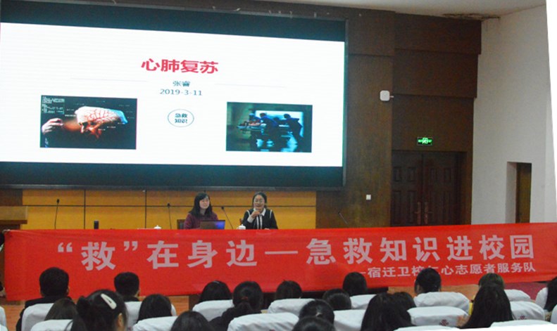 宿迁卫校仁心志愿者服务队“救”在身边――急救知识进校园项目,旨在普及急救知识和技能,播撒挽救生命的火种。