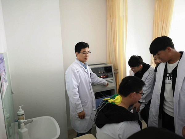 科主任苏宁亲切的迎接了大家。在给学生们简单的介绍了科室的情况之后,苏老师带领学生们对科室进行了参观,同时给学生们示范了几种常见康复仪器的使用方法,如蓝紫光治疗仪、干扰电治疗仪、超声波治疗仪以及手功能训练仪等的操作。鼓励学生主动尝试、动手操作并及时指正。