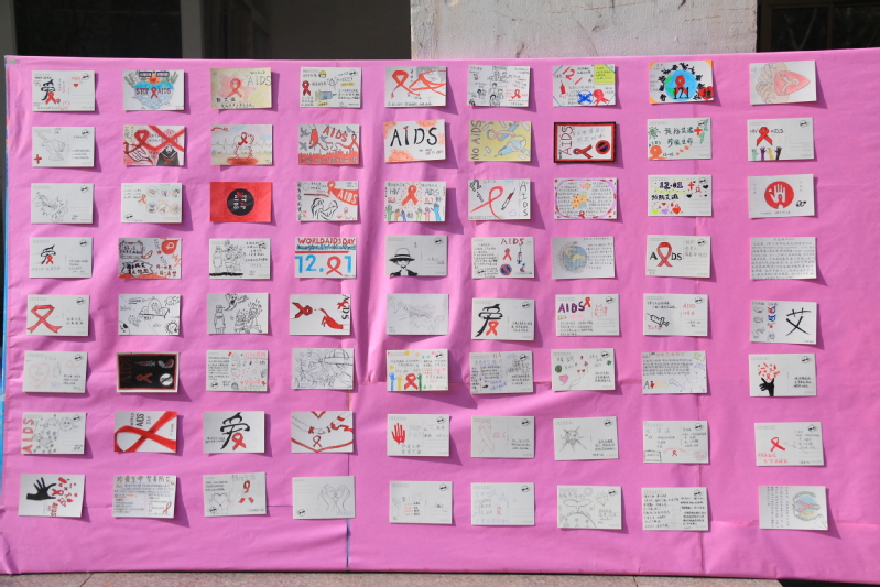仁爱志愿者协会于26日中午在北餐厅门口举办以“遏制艾滋,呼吁拥抱;控制蔓延,共享阳光”为主题的防艾明信片展示活动。并对展示的明信片进行投票,选出最有特色的防艾明星片。