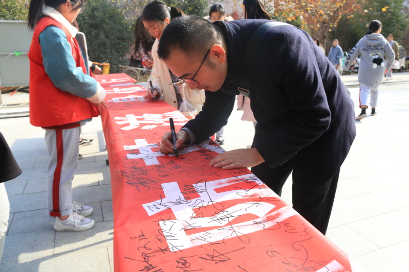27日,宿迁卫校防艾小队在北餐厅门口开展以“珍惜健康,把握生命;预防艾滋,身体力行”为口号的横幅签字活动,让每个学生都能参与到防艾的工作中来。