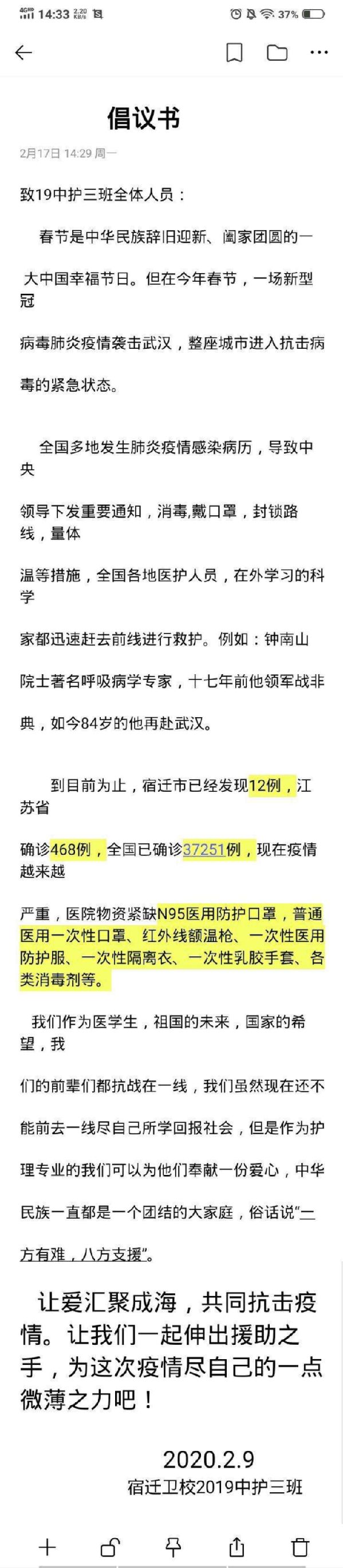 新型冠状病毒肺炎疫情牵动人心,据悉,2月10日、11日,宿迁卫校2019级中护三班自发组织募捐,通过宿迁市红十字会向湖北新型冠状病毒肺炎疫情防控专项捐款615元,全班师生为疫情防控做出应有的贡献,众志成城,共同抗击疫情。