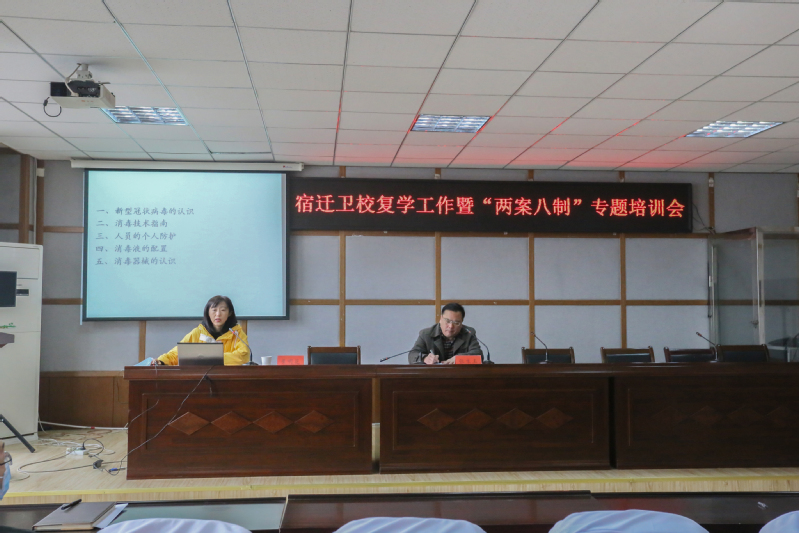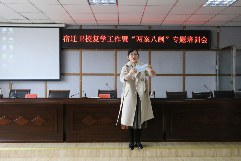 崔明花从新型冠状病毒的认识、消毒技术、消毒人员的个人防护、消毒液配置、消毒器械认识等几个方面对教职工进行培训。重点讲解空气、物体表面、接触频繁的物体、饮用水、地面、餐饮具、卫生间等消毒方法和注意事项。教职工张为为老师现场讲解并示范七步洗手法、几种不同类型口罩的佩戴及废弃口罩的处理方法。农村医学系副主任周明臣就《宿迁卫校新冠肺炎疫情防控应急处置预案》和《两案八制》,讲解了复学后的工作安排,主要涉及校园封闭管理、开学师生报到、师生晨午检、持续做好卫生防疫等,对发热或疑似人员的处置和交接流程做了重点培训。办公室副主任章浩带领大家学习《宿迁卫校新冠状病毒肺炎疫情防控工作方案》,提出适当提高饭菜质量、对全体师生进行诚信教育等细节。
