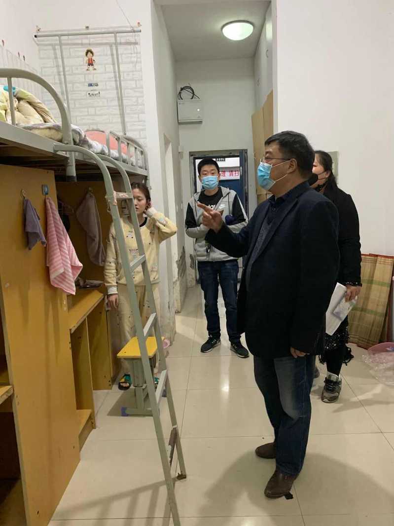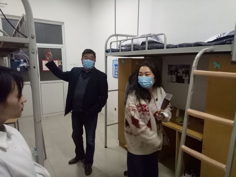 在走访过程中,校领导一行先来到2号楼,实地查看了宿舍、隔离观察室等重点区域,详细了解各环节防疫措施落实情况。王辉阳和同学们一起拉家常、聊生活、问学习。鼓励同学们在这个疫情防控的特殊时期,一定要遵守学校纪律,做好自我管理,自觉学习,保持良好心态,备战护考,争取在职护考试中考出好成绩。潘靖引导学生戴好口罩,做好体温测量、清洁消毒、宿舍通风等各项防护措施。