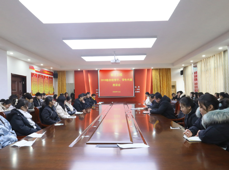 12月16日下午,宿迁卫校召开学生代表座谈会。校党委书记、副校长张生玉出席会议并与学生代表亲切交谈。学工处副处长包成银和18级60名学生代表参加座谈会。座谈会由包成银主持。