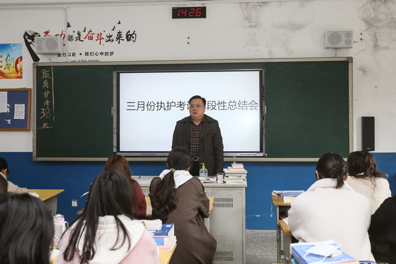 王辉阳到2016级高护2班参加主题为“执护模拟考试总结”的班会,王辉阳首先从社会需求的角度分析了护士执业资格证书的重要性,他指出,护理工作是朝阳产业,随着国家医疗水平的不断发展,护理这种专业性比较强的学科人才,社会上是非常紧缺的,随着护理执业资格证书在社会上的认可度不断提升,所对应的学历门槛也越来越高,取得证书的难度将会不断增大,因此,同学们要从思想上重视起来,抓住有利时机,好好学习。其次,王辉阳还对学校近两年高职执护考试及就业情况进行了剖析,他强调证书不只是一纸文凭,更是对自己能力的一种认可,会对自己日后的学习和生活起到很大的帮助。最后,王辉阳还鼓励学生们认真复习迎考,争取执护考试全部通过。