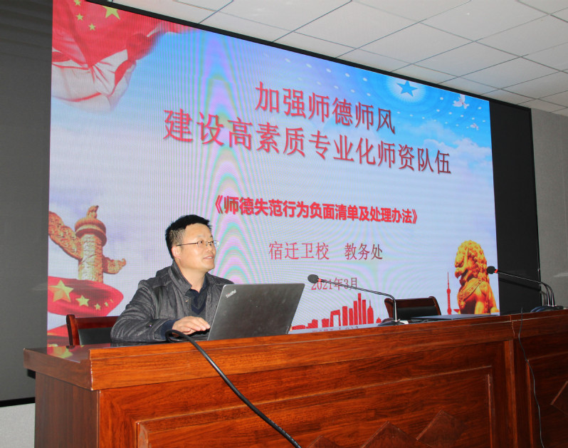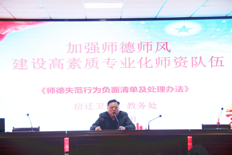 陶行知先生曾经说过:“学高为师,身正为范。”为加强教师师德师风思想政治工作,弘扬新风正气,培育高素质专业化师资队伍,3月25日下午,宿迁卫校举行“加强师德师风建设高素质专业化师资队伍”为主题的校本培训,校党委书记、副校长张生玉出席会议并讲话,副校长王立、潘靖及全体教师参加会议,会议由科研处副处长张丽艳主持。
