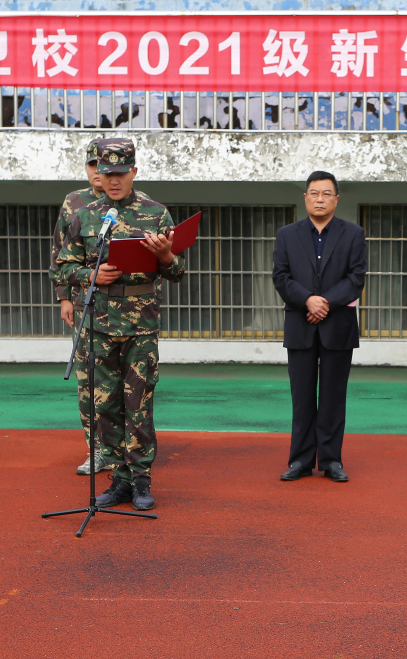 21级高助1班戴宇朦同学代表全体新生向领导和教官保证:一切行动听指挥,以军人的身份严格要求自己,努力培养吃苦耐劳的精神;认真进行列队操练,努力完成规定的军训任务;认真学习国防知识,严格遵守各项纪律和作息时间。