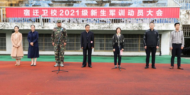 金秋送爽,惠风和畅。10月11日上午,宿迁卫校举行2021级新生军训动员大会。宿迁卫校王辉阳校长,潘靖副校长出席大会,学工处荣峰处长、军训总教官韩华侨、护理系仲琴主任、医学系周明臣主任、药学系唐清副主任,所有教官、21级班主任及全体新生参加了动员大会。大会由潘靖主持。