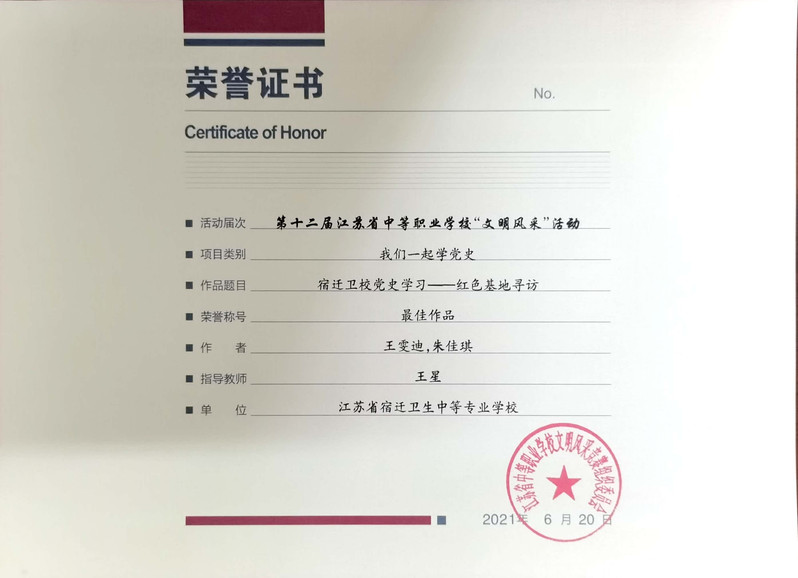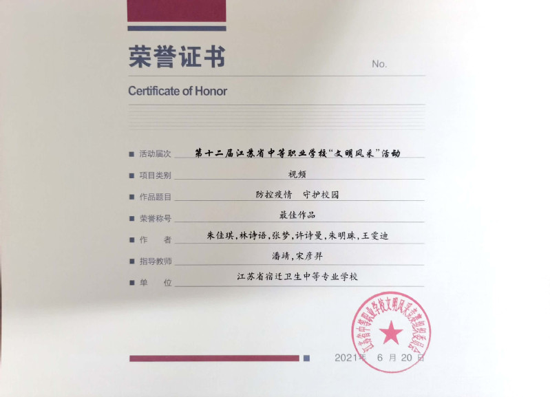 近日,由教育部办公厅、共青团中央办公厅、全国妇联办公厅中国关工委办公室、中华职业教育社联合主办的第十一届全国中等职业学校“文明风采”竞赛全国决赛获奖名单揭晓,宿迁卫校推荐参赛的我们一起学党史作品《宿迁卫校党史学习—红色基地寻访》、视频作品《防控疫情 守护校园》喜获“最佳作品”奖,3名老师被评为优秀指导教师。