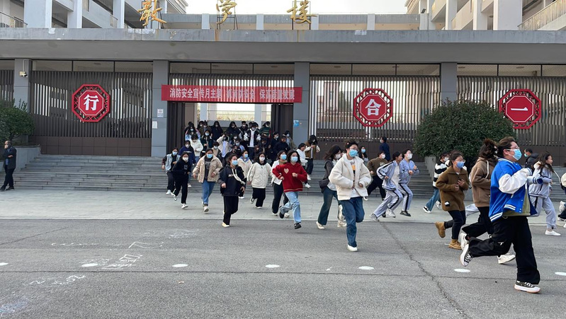 下午三时二十八分,张超宣布演练正式开始,警报声立刻响彻校园,各小组人员立即就位,迅速指挥学生进行疏散,同学们用手、衣袖等捂着口鼻,弯腰快走。在师生的共同配合下,所有人员平安、顺利地在预定时间内完成撤离任务,整个过程快而不乱,静且有序。