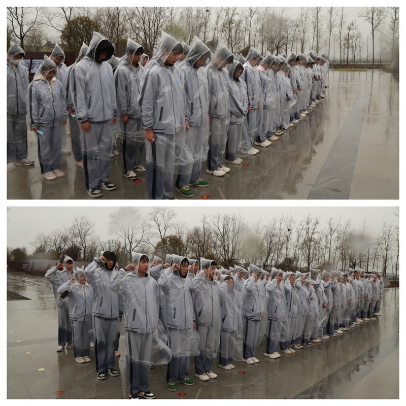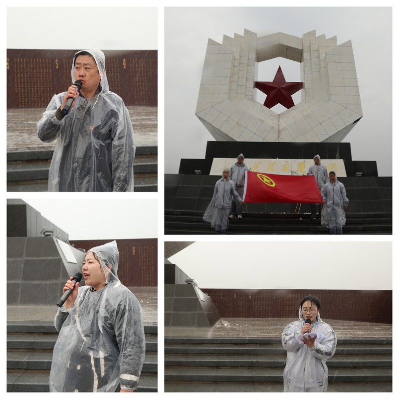 仪式在庄严肃穆的国歌声中开始,全体师生在纪念碑前默哀一分钟,诉说自己对革命先烈的哀思。伴随着雨声,宿迁卫校优秀共青团员代表叶相伶同学以“缅怀英烈 砥砺前行”为主题,号召全体学生心怀感恩,缅怀先烈,报效祖国。虽大雨如注,却不如当年的血雨腥风,雨水无法浇灭青年学生对革命烈士的敬仰之情,王星书记泪光闪闪地告诫所有青年学生们珍惜当下、不负好时光。荣峰处长给在场学生开展了以《宿北大战》为题的微党课,生动地讲述了宿北大战烈士们的丰功伟绩,激励同学们坚定理想信念,牢记初心使命。在这样特殊的时刻,团员们高举右拳,重温入团时的铮铮誓言。嘹亮的誓言徘徊在公园内,抒发了青年一代为共产主义事业而不断努力奋斗的强音。最后,全体师生依次绕行敬献鲜花,朵朵白花寄托着大家的敬仰和感慨,正如烈士英雄纪念碑四周的浮雕所诉,革命先烈们前赴后继、无畏牺牲、勇往直前,用鲜血和生命谱写了可歌可泣的篇章。