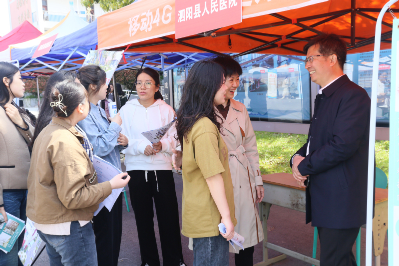 学校贯彻落实就业“一把手”工程,深入开展“访企拓岗促就业”行动。在招聘会现场,宿迁卫校党委书记、校长张超一行与用人单位和毕业生面对面交流,了解用人单位的招聘需求,询问毕业生的求职意向。