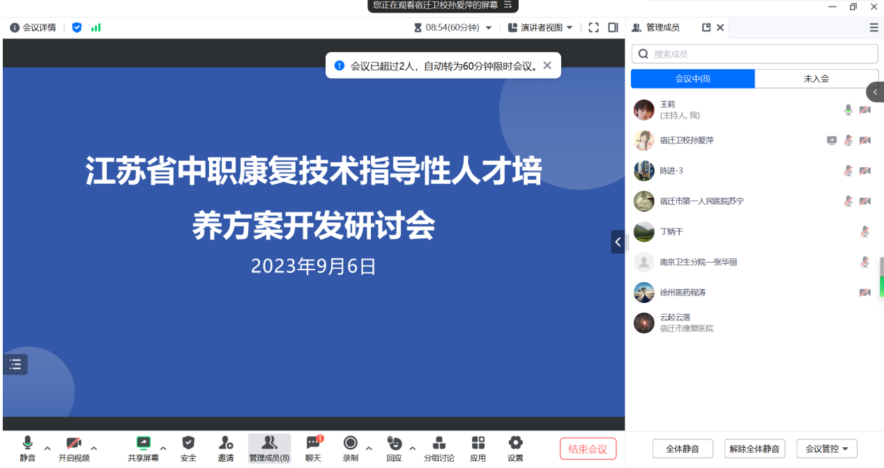 9月6日,宿迁卫校开展了江苏省中职医护康复专业类康复技术专业指导性人才培养方案线上研讨会。出席会议的有南京卫生高等职业技术学校张华丽主任、江苏医药职业学院陈进主任、江苏省徐州医药高等职业学校程涛主任、宿迁市第一人民医院苏宁主任、宿迁市康复医院张超主任和宿迁卫校教务处丁炳干处长、医学系王莉副主任和康复教研室孙爱萍主任。