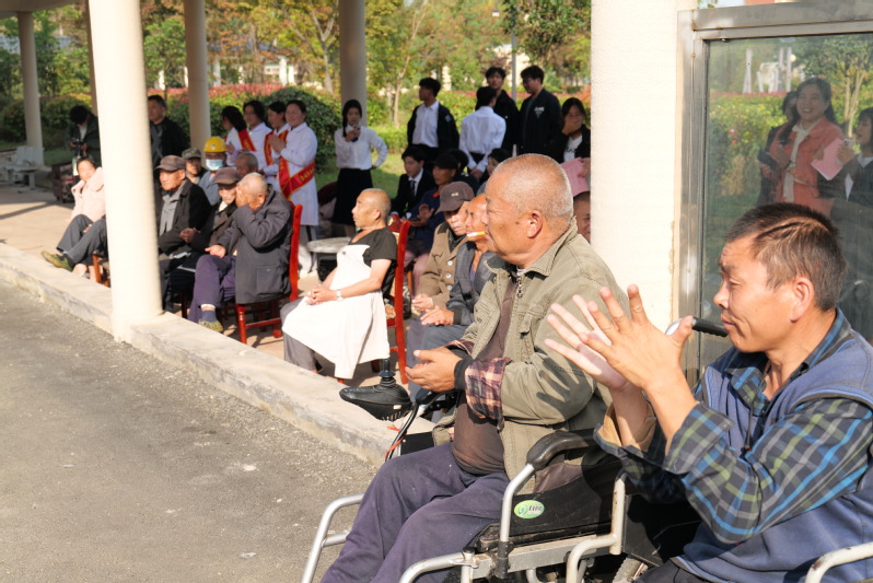 演出结束后青年学生们老人们共话家常,关切问询其身体健康状况和在敬老院的生活情况,给予老人精神上的慰藉和鼓励。青年学生用实际行动关爱长者、传递爱心,凝聚向上向善力量。