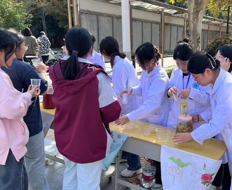 经过社团前期分析、讨论、策划,选定具有清热解毒作用的双花(菊花、金银花)山楂茶、可以清肝明目的枸杞桂圆茶以及能够健脾利湿的山楂决明荷叶茶。广大师生积极参与活动,品尝了社团成员准备的养生茶,纷纷为他们的专业和辛勤付出点赞。本次活动既给大家带来了中医养生知识,还增强了同学们对健康的重视和关注,为校园健康生活添加了一味“良方”。