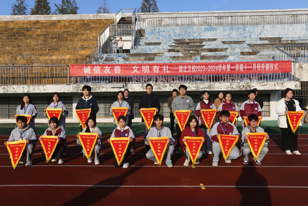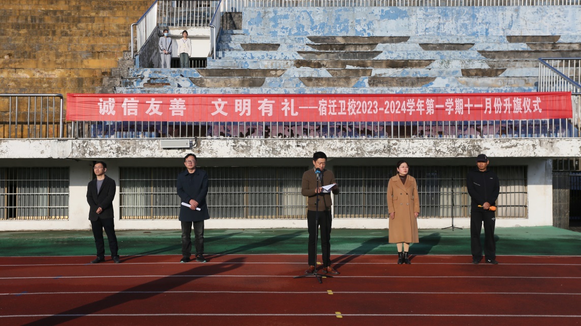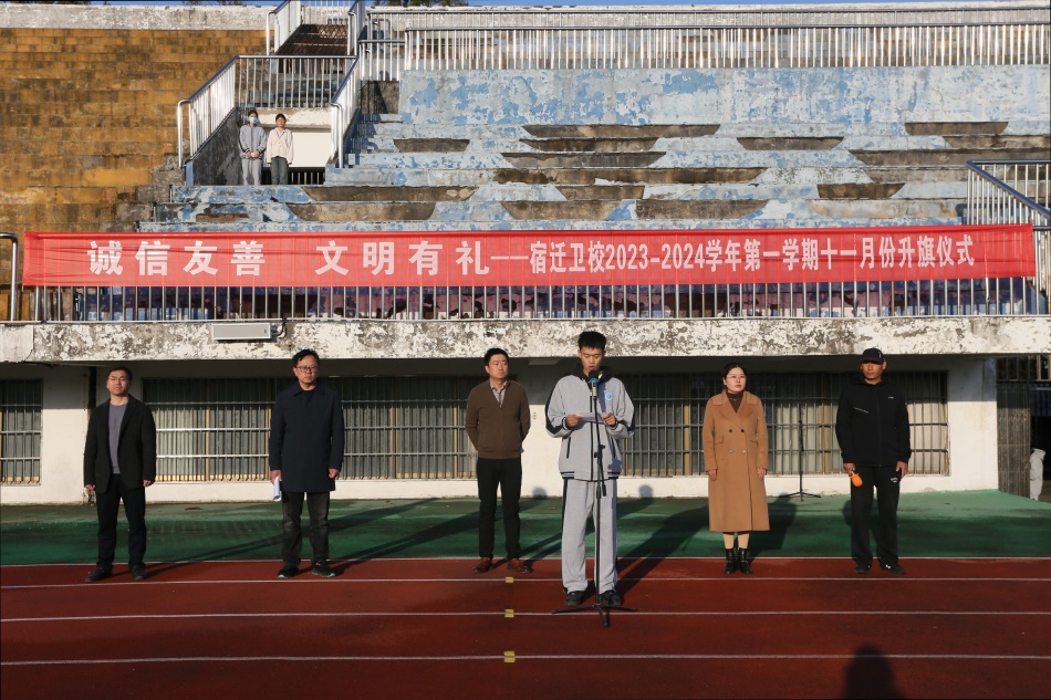 为深入推进和谐校园创建,营造“言必诚信,行必中正”的良好氛围,11月6日,宿迁卫校在操场举行以“诚信友善 文明有礼”为主题的升旗仪式,学工处处长荣峰,副处长包成银、杨振宇,系部分管主任,在校班级班主任及全体在校生参加升旗仪式,升旗仪式由杨振宇主持。