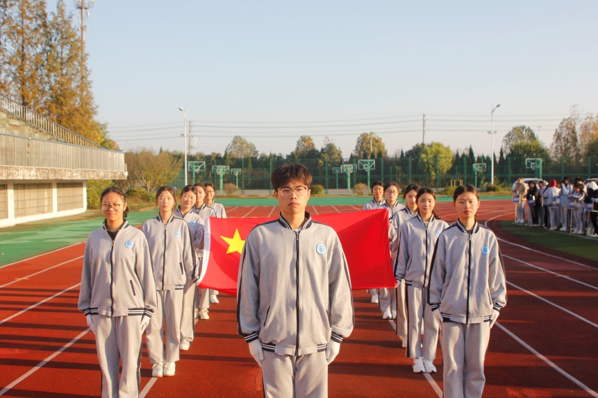 在熠熠晨光中,国旗护卫队迈着铿锵有力的步伐,护送国旗走向升旗台。伴随着雄壮高亢的国歌响起,鲜艳的五星红旗冉冉升起,迎风飘扬,全体师生庄严肃立,面向国旗行注目礼。