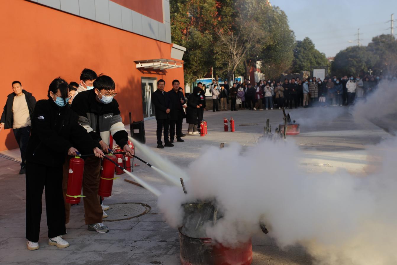 经过约3分多钟,两千七百余名在校学生和一百余名教职工全部疏散完毕。各楼栋负责人纷纷汇报疏散用时,其中最快56秒,平均用时不到3分钟。演练也顺利进入了第二阶段,各系部、处室以及学生代表前往预定地点进行灭火考核。他们分成几组,合作进行灭火:拿起灭火器,站位、拔销、压把一气呵成,对准火苗根部灭火,很快扑灭了火桶内的火焰。