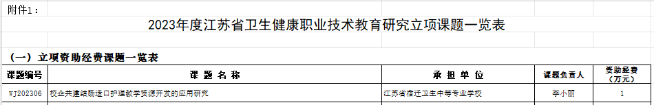 近日,江苏省卫生健康职业教育行业指导委员会公布了2023年度江苏省卫生健康职业技术教育研究立项课题名单,宿迁卫校李小丽老师主持的《校企共建结肠造口护理教学资源开发的应用研究》获得立项资助经费课题,丁炳干老师主持的《中职康复技术专业指导性人才培养方案的开发与研究》和郑曼曼老师主持的《卫生职业院校贫困生心理健康状况调查及干预研究》获得立项自筹经费课题。