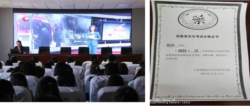 一是举办实验室安全知识讲座。实验室安全责任人、药学检验系副主任唐清从全国安全生产形势、高校实验室安全管理现状、实验室常见安全风险与事故隐患和实验室事故预防方法等方面详细介绍了实验室安全的重要性和实验室管理的规范性。郑玲玲老师作《实验室安全与事故预防》专题讲座,并在学习通平台开设《实验室安全教育》课程,对学生进行为期一周的线上实验室安全教育。学习结束后组织学生进行实验室安全知识考试,对培训合格的学生颁发合格证书。