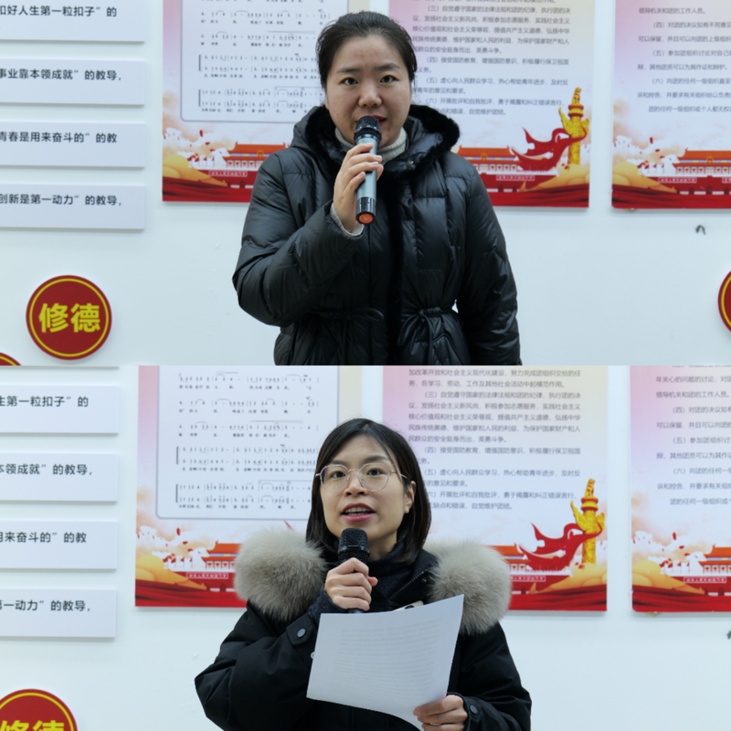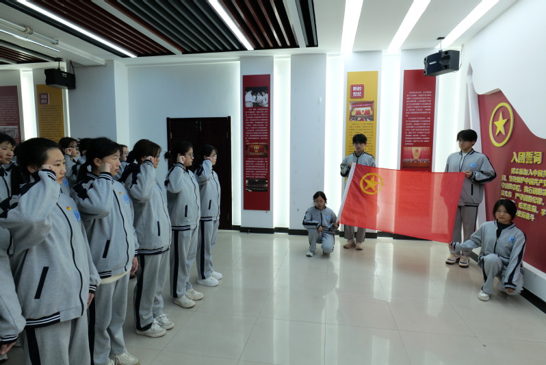 仪式在庄严的团歌声中拉开帷幕,鲜红的团旗下,老团员庄重地为新团员佩戴了团徽,他们高举右拳,以洪亮的声音庄严地宣誓,表达了同学们对共青团组织的无限向往。在团旗下,新团员代表进行了郑重承诺并号召全体团员坚守信念、勤奋学习,严格要求自己,不断完善自我,无愧于共青团员的称号,用自己的实际行动为中国共产主义青年团增光添彩。老团员代表发言表示作为团员,要在学习、劳动、生活等各个方面始终起模范带头作用,坚持与同学共勉,互帮互学,共同进步。教师代表对新团员加入共青团表示祝贺,也给团员提出了要求,希望每位团员从佩戴上团徽之时起,就要肩负起团员的责任,努力履行团员的义务。