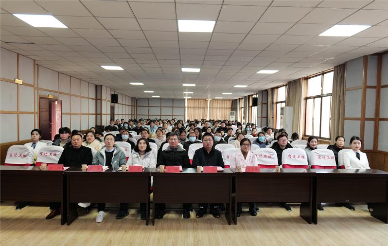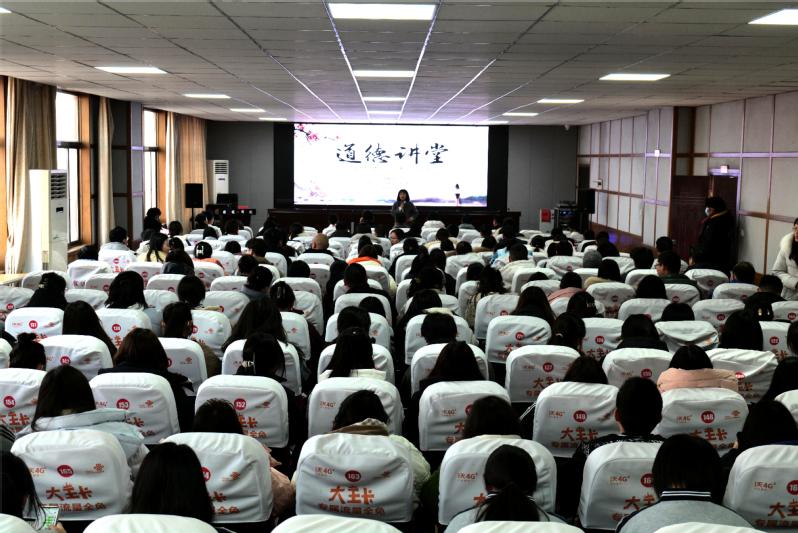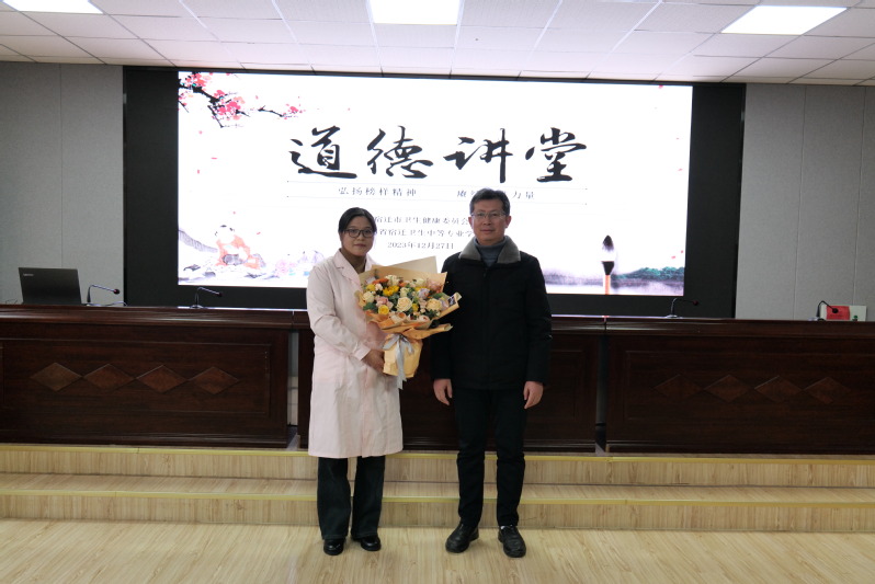 为深入学习贯彻党的二十大精神,充分发挥先进典型示范引领作用,进一步提升全体教职工思想道德水平和文明素质,以实际行动培育和践行社会主义核心价值观,12月27日,宿迁卫校举办“弘扬榜样精神 赓续奋进力量”道德讲堂活动。宿迁卫校领导班子成员,全体教职员工,优秀团员代表共200余名师生参与此次活动。活动还特邀到了泗洪县卫健委宣传科负责人,2020年8月“中国好人榜敬业奉献好人”吕正红医生。道德讲堂围绕“看短片、学模范、送爱心、谈感悟、诵经典、唱首歌”六个环节开展。
