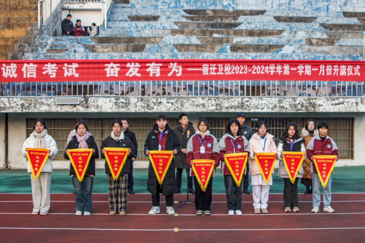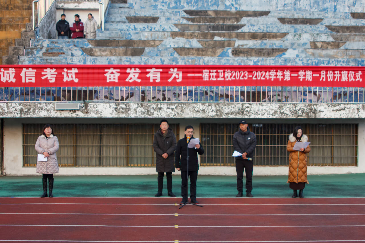 考试周已悄然而至,为深入推进诚信校园创建,营造“公平、公正、诚信”的考试氛围,1月8日,宿迁卫校在操场举行以“诚信考试 奋发有为”为主题的升旗仪式,学工处处长荣峰,副处长包成银、杨振宇,系部分管主任,在校全体班主任及学生参加升旗仪式,升旗仪式由杨振宇主持。