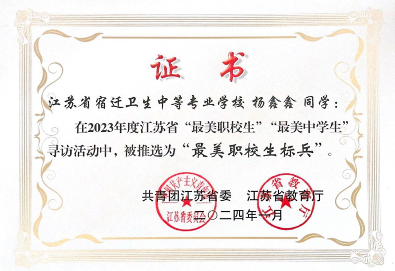 近日,共青团江苏省委、江苏省教育厅联合举办的2023年全省“最美职校生标兵”“最美职校生”寻访活动评选结果揭晓。宿迁卫校2019级高助1班杨鑫鑫脱颖而出,荣获江苏省“最美职校生标兵”称号。