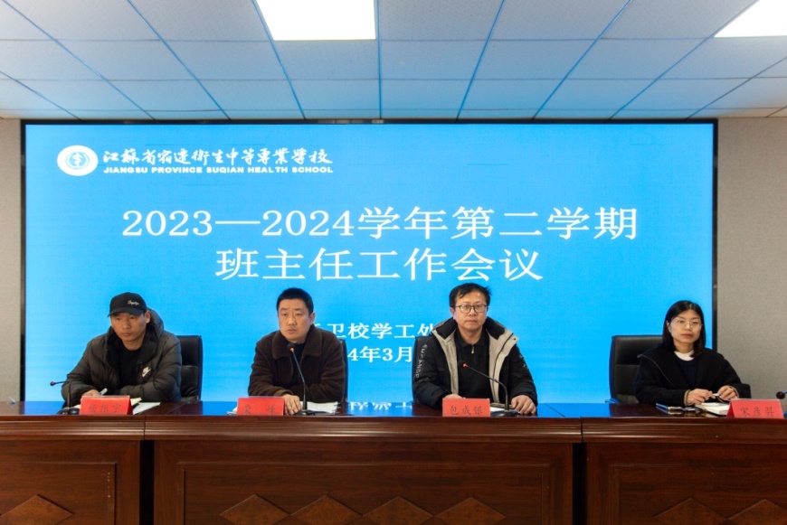 为强化常规,明确方向,提升班主任整体的工作水平,确保江苏省五年制高等职业教育评估工作顺利开展,学校于2024年3月15日下午召开宿迁卫校2023—2024学年第二学期班主任工作会议。会议由学工处副处长宋彦羿主持,校党委委员、学工处处长荣峰,副处长包成银、杨振宇,系部分管主任及全体班主任参加会议。