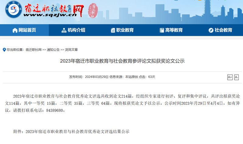 前期,学校科研处根据宿迁市职业教育与社会教育教研室《关于开展2023年宿迁市职业教育与社会教育优秀论文评选活动的通知》文件要求认真做好宣传发动工作,动员学校教师积极参评。在论文选题、文体要求、上报要求等方面,科研处严格按照市职社教研室下发的通知落实,并组织人员进行初评,遴选推荐优秀论文上报宿迁市职业教育与社会教育教研室参评。