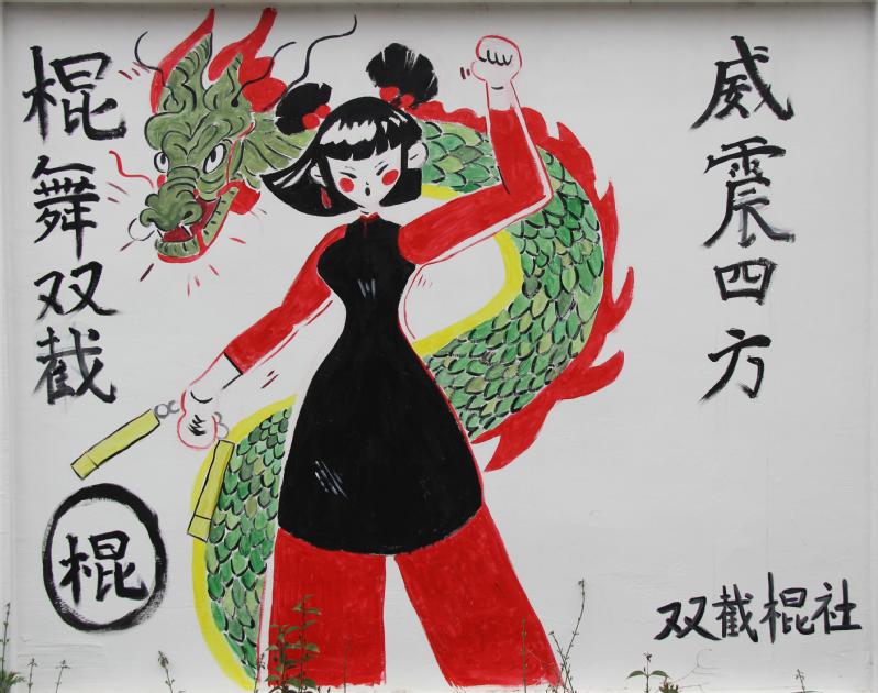 其中,双截棍社的墙绘与中华优秀传统文化相结合,在注重色彩运用的同时还注重线条的运用,在评比中获得一等奖。