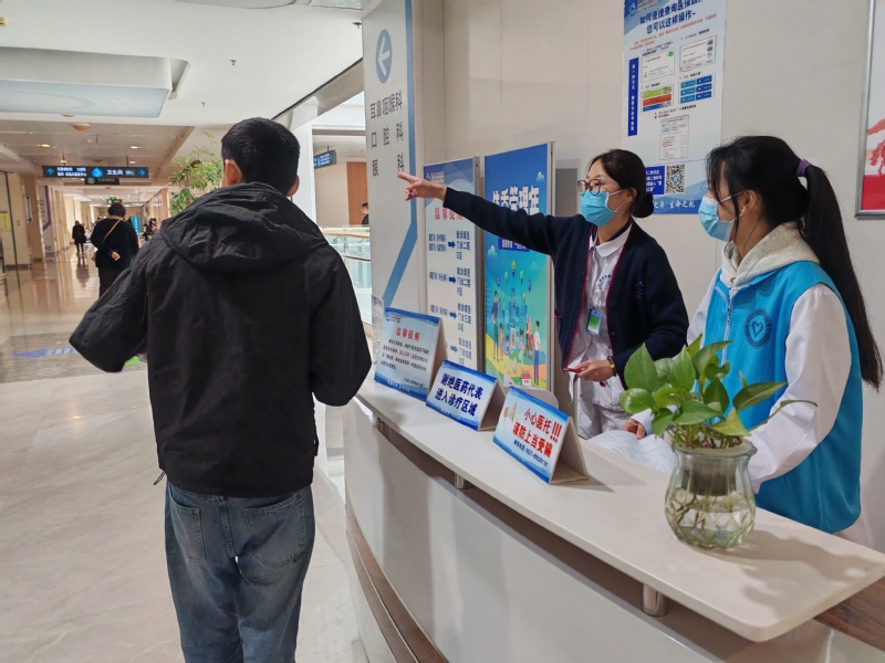 活动前,学生志愿者提前熟悉医院布局与服务流程,根据医院实际需求划分多个服务岗位,以便快速投入“实战”。活动当天,自动挂号机旁,志愿者化身“操作小助手”,耐心协助老年患者、不熟悉智能设备的群众操作自助挂号机,从选择科室信息到打印凭条,全程细致指引,有效减少了人工窗口排队压力;药房取药区,志愿者引导患者凭处方单取药,告知用药注意事项,帮助行动不便的老人拿取药品,缩短了患者等待时间;导医台咨询处,志愿者则成了“活地图”,面对患者“CT室怎么走”“内科门诊在几楼”等问题,总能清晰解答,同时协助轮椅、平车借用登记,让就医咨询更便捷。“通过亲身体验医院服务流程,我们更懂患者需求,也更明白医护工作的责任。”2022级高护2班汤紫月说。