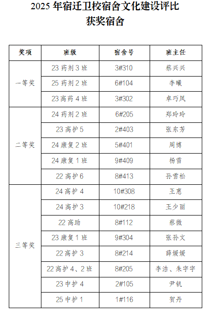 经过激烈角逐,最终23药剂3班、25药剂2班、23高药4班宿舍荣获一等奖;24药剂2班、23高护5班、24康复2班等五个班级的宿舍荣获二等奖;24高护4班、24高护3班、22高助班等八个班级的宿舍荣获三等奖。
