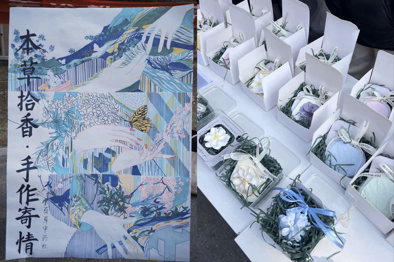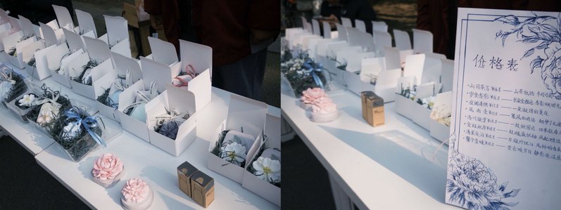 现场展区布置温馨而富有创意,香薰挂牌以“山月茶言”“岁金杏彩”“夜阑清供”等雅致名称陈列,配以牛皮纸环保包装和个性化定制服务,彰显出同学们的细致匠心与创新意识。