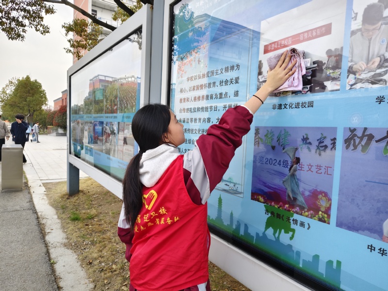 活动现场,志愿者们分工协作、配合默契。有的负责清理橱窗表面的灰尘和污渍,有的用湿抹布擦拭边框和玻璃,有的用专业工具刮除顽固水渍。尽管部分橱窗位置较高、清洁难度较大,但志愿者们始终保持高涨的热情,不怕脏、不怕累,认真细致地擦拭每一处角落。经过一个多小时的辛勤劳动,所有宣传栏橱窗都焕然一新,玻璃光洁透亮,边框一尘不染,宣传内容清晰可见,成为校园里一道亮丽的风景线。