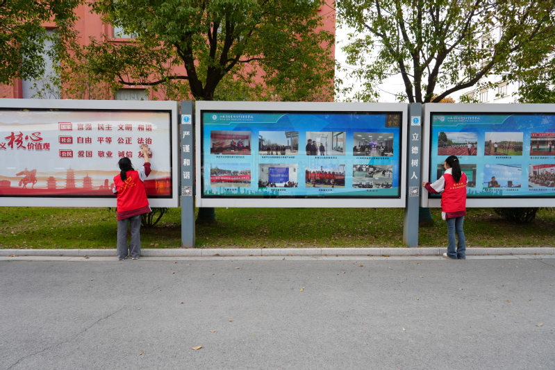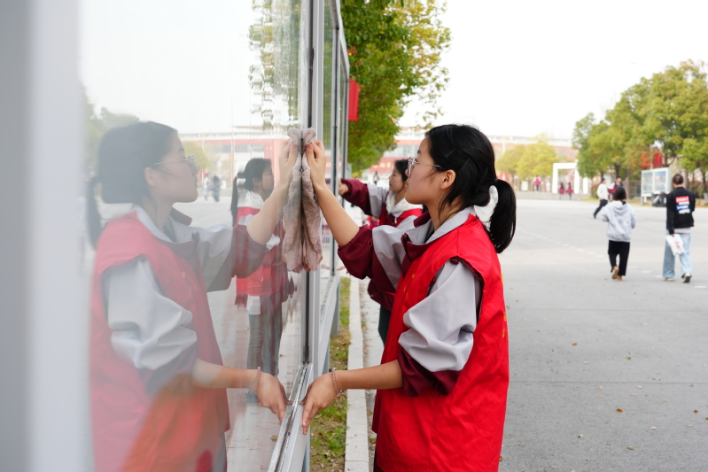 活动现场,志愿者们分工协作、配合默契。有的负责清理橱窗表面的灰尘和污渍,有的用湿抹布擦拭边框和玻璃,有的用专业工具刮除顽固水渍。尽管部分橱窗位置较高、清洁难度较大,但志愿者们始终保持高涨的热情,不怕脏、不怕累,认真细致地擦拭每一处角落。经过一个多小时的辛勤劳动,所有宣传栏橱窗都焕然一新,玻璃光洁透亮,边框一尘不染,宣传内容清晰可见,成为校园里一道亮丽的风景线。